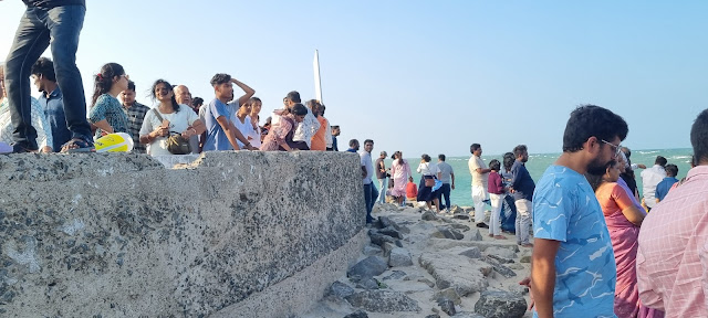 There was maddening incredible rush and traffic jam up starting about 2 km before the last point. It seemed as if the whole town had come to this place today. The narrow strip of land jutting into the sea was lined up with parked vehicles on both sides. So, our driver parked the car and we 4 walked to the last point. It is a roundabout with an Ashok emblem pillar erected there. It was such a beautiful scene. The Bay of Bengal is on one side and Indian ocean is on the other side of this narrow strip of land. People were rejoicing. Though it was sunny day but we were not feeling the heat as the wind was blowing in its full vigour. From here, in distant sea, we could see small patches / strips of land which are believed to be the part of the now submerged Ramsetu !